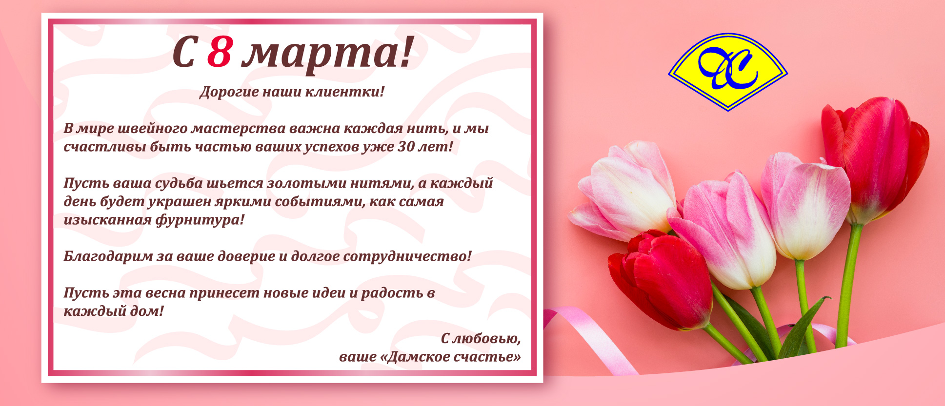 Начав в 1995 году свою деятельность с розничного магазина, наша фирма на сегодняшний день является лидером на рынке оптовой торговли швейной фурнитурой. В 1998 году фирма ООО "Арго ДС " зарегистрировалась под торговой маркой " Дамское счастье ", широко известной в настоящее время многочисленному кругу покупателей и производителей. Сегодня "Дамское счастье"- крупнейшая фирма России, которая занимается оптовой торговлей швейной фурнитуры. Наш ассортимент включает в себя более 50 000 наименований и постоянно пополняется новинками к каждому сезону. За фирмой "Дамское счастье" давно и прочно укрепилась репутация надежного, перспективного, добропорядочного партнера, с которым выгодно и удобно вести долгосрочное, плодотворное сотрудничество. Мы очень быстро перестраиваемся, откликаемся на любое изменение спроса, работаем для покупателя, "держим" цены.